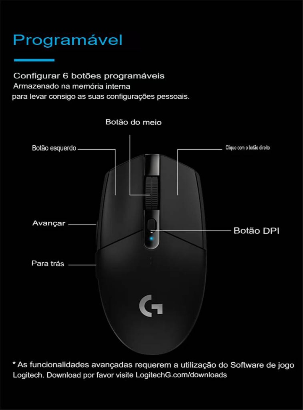O Logitech G304 conta com 6 botões programáveis e memória interna, permitindo salvar configurações diretamente no mouse.