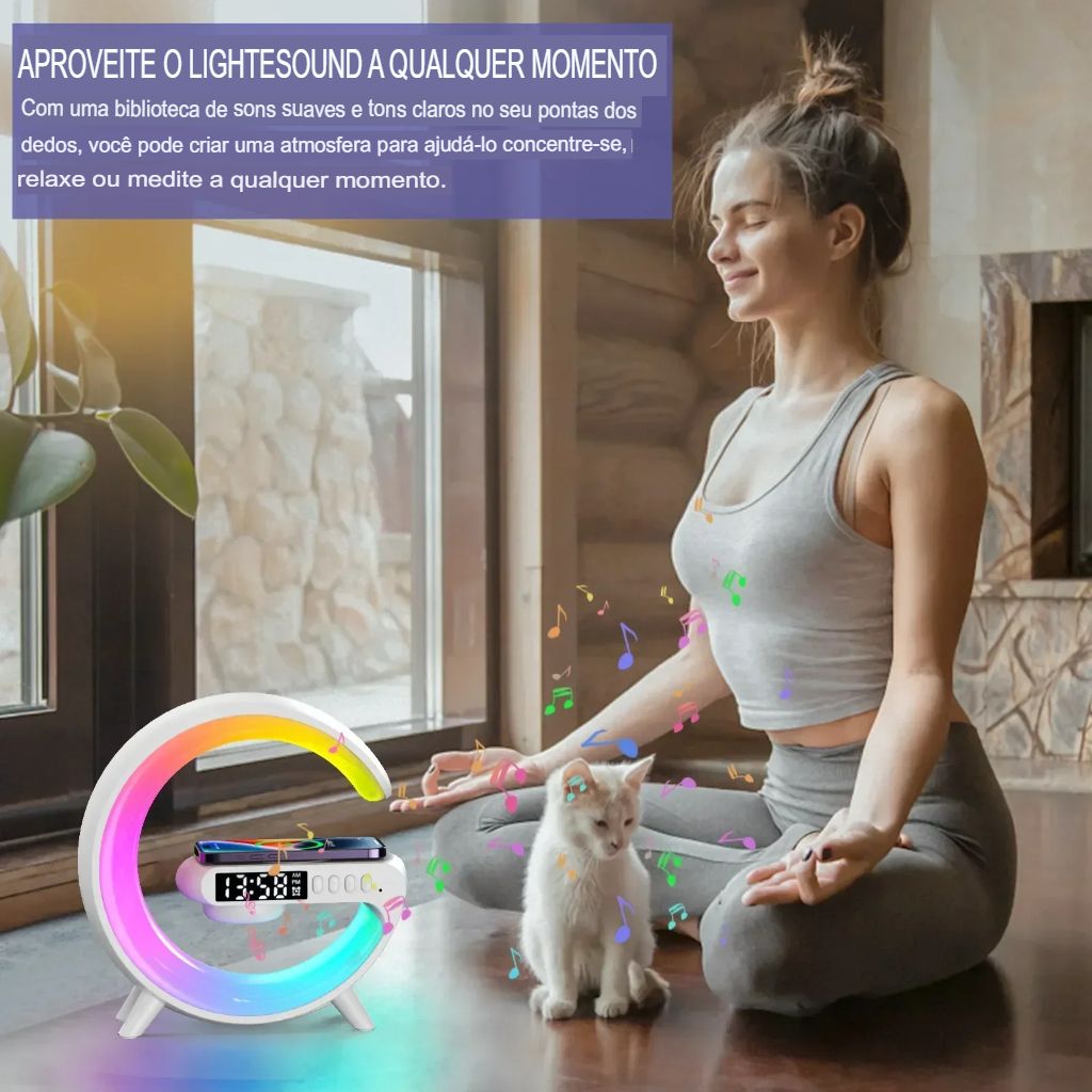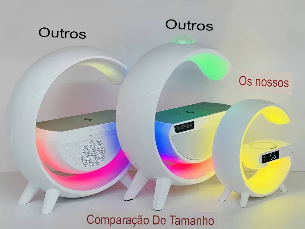 Com design moderno e luzes coloridas, ele combina carregamento rápido, som de qualidade e funções inteligentes, tornando seu espaço mais prático e estiloso.