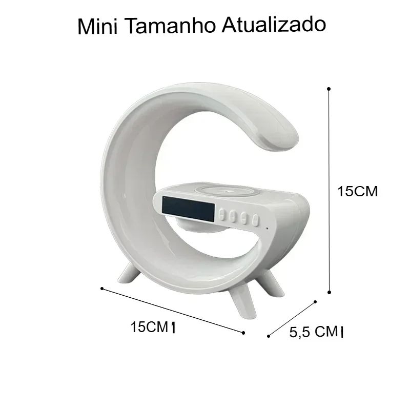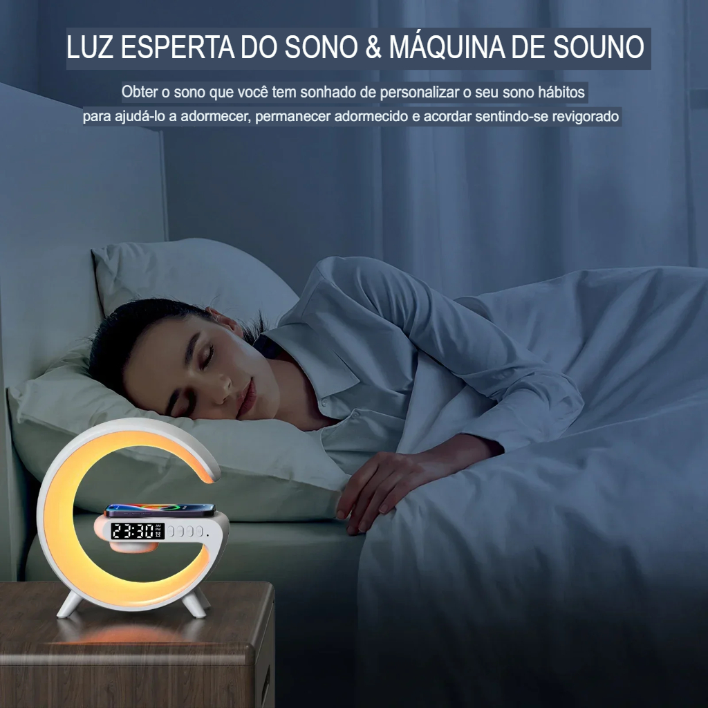 Com design moderno e funções 4 em 1, ele combina carregamento rápido, som potente, iluminação ambiente e despertador inteligente em um único produto.