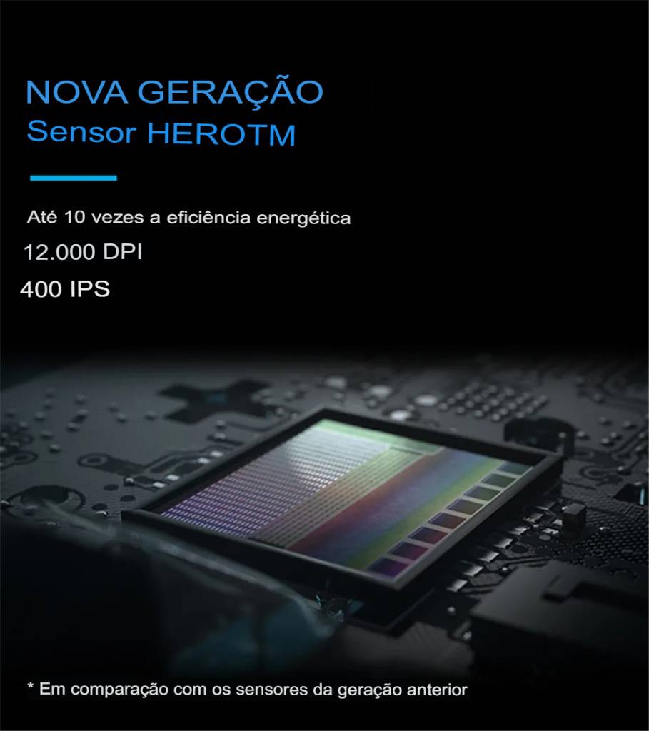 Com até 10 vezes mais eficiência energética do que sensores convencionais, o HERO™ oferece rastreamento ultrafino de 400 IPS e sensibilidade ajustável de até 12.000 DPI, garantindo resposta instantânea e precisão cirúrgica em cada movimento.