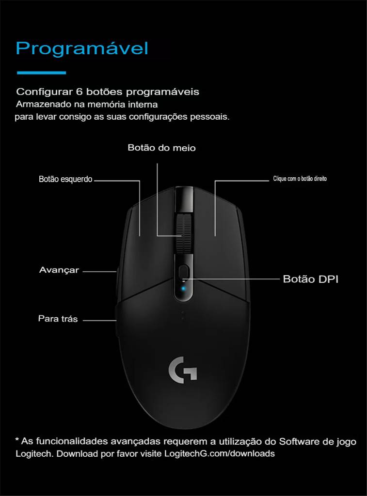 Além disso, o G304 conta com botão central, ajuste dinâmico de DPI e dois botões laterais personalizáveis via software Logitech G HUB, permitindo que você adapte cada detalhe à sua estratégia.