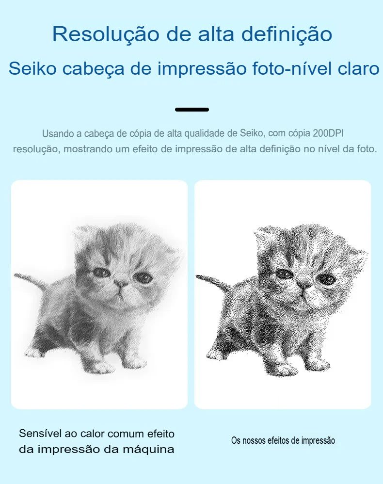 A tecnologia de impressão térmica utiliza calor de precisão para gerar textos e imagens nítidas em segundos, sem precisar de tinta, toner ou cartuchos.